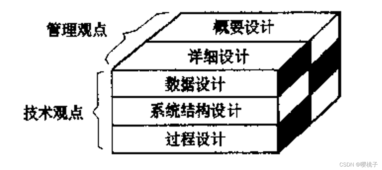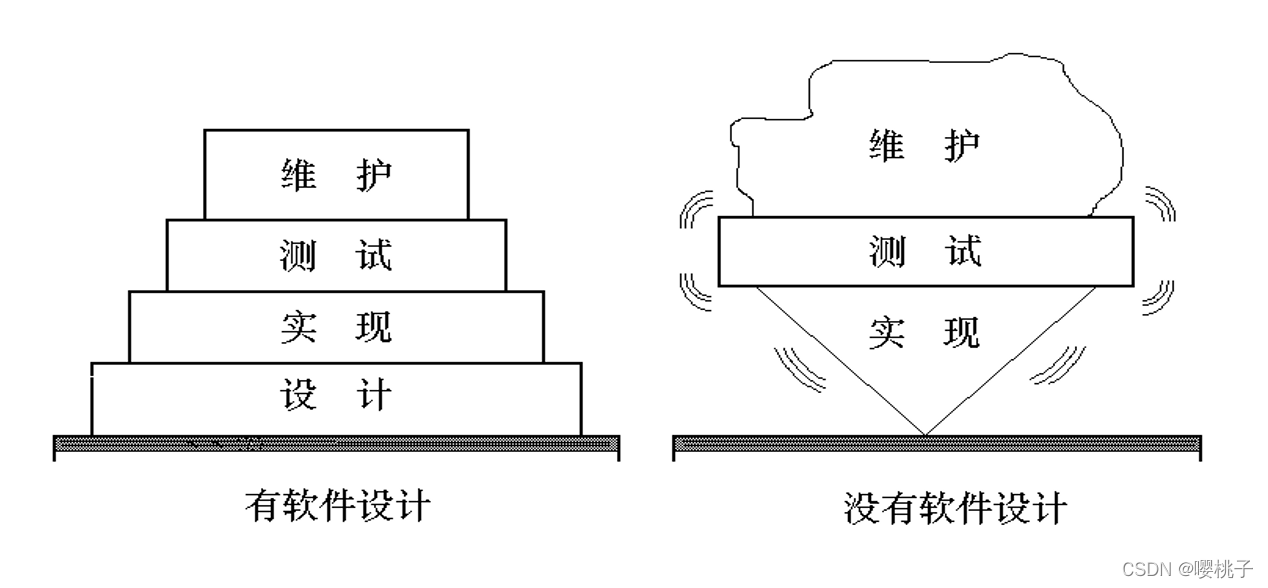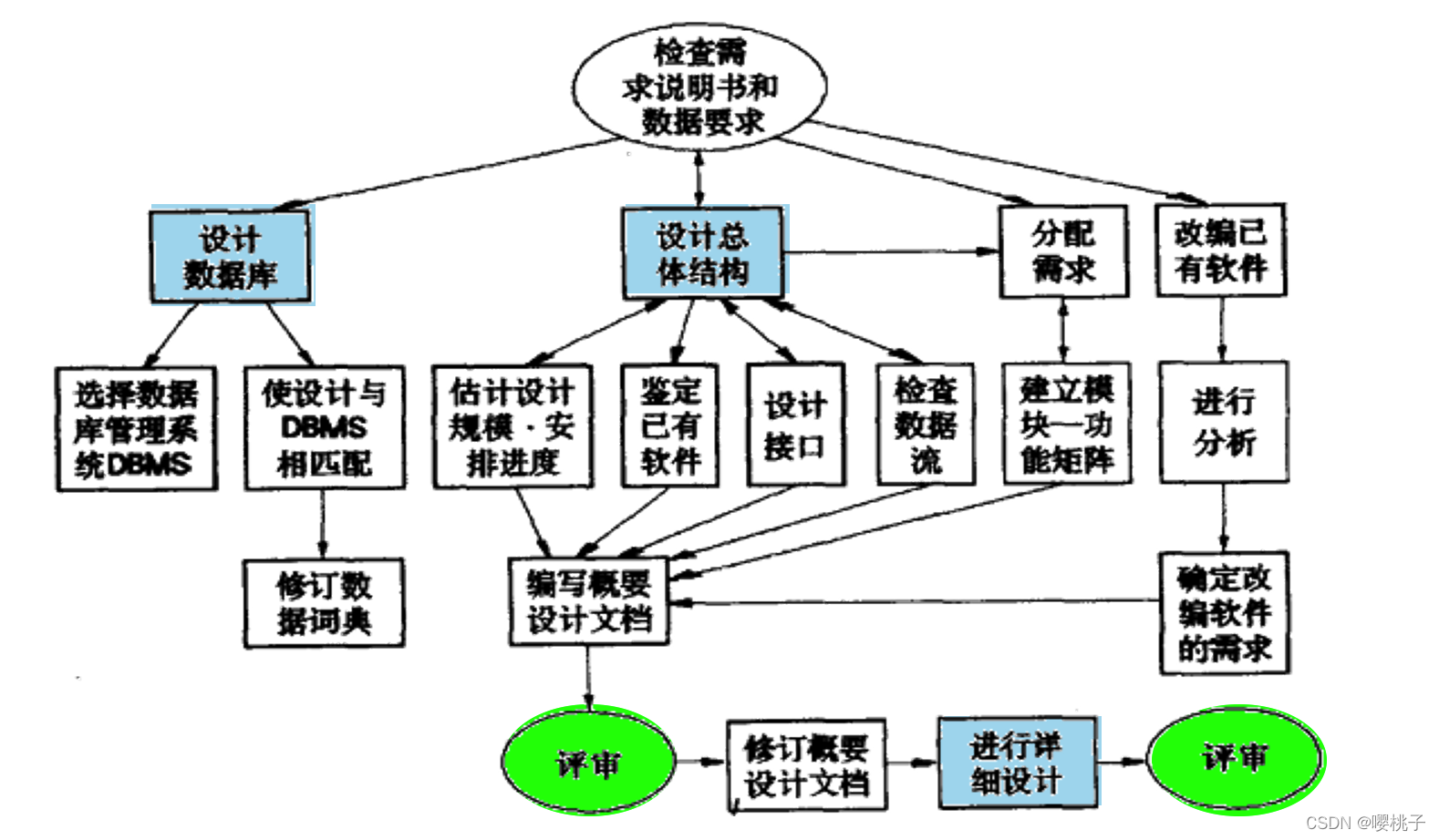 ③ 软件设计:设计是软件工程的技术核心。把已确定了的各项需求转换成一个相应的体系结构。进而对每个模块要完成的工作进行具体的描述。编写设计说明书,提交评审。