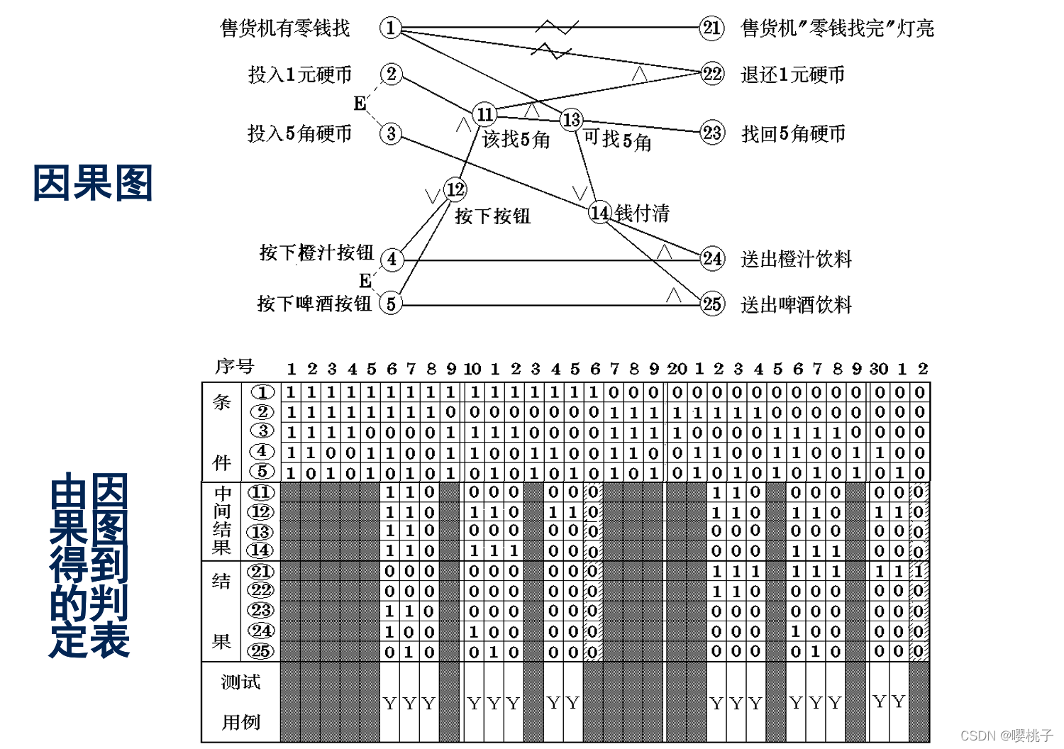 如果在测试时必须考虑输入条件的各种组合,可能的组合数将是天文数字。因此必须考虑使用一种适合于描述对于多种条件的组合,相应产生多个动作的形式来考虑设计测试用例,这就需要利用因果图。