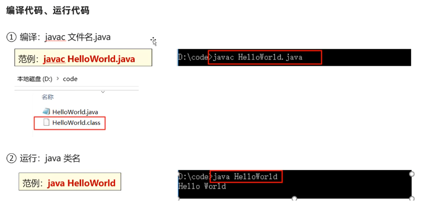 - 编译代码:将人能看懂的源代码(.java文件)转换为Java虚拟机能够执行的字节码文件(.class文件)