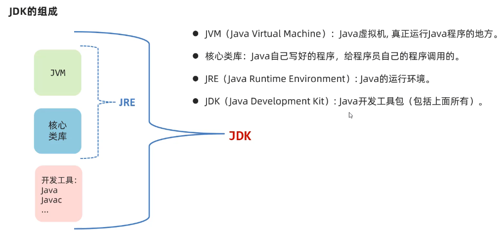- JDK = JRE +开发工具集(例如Javac,java编译工具等)
