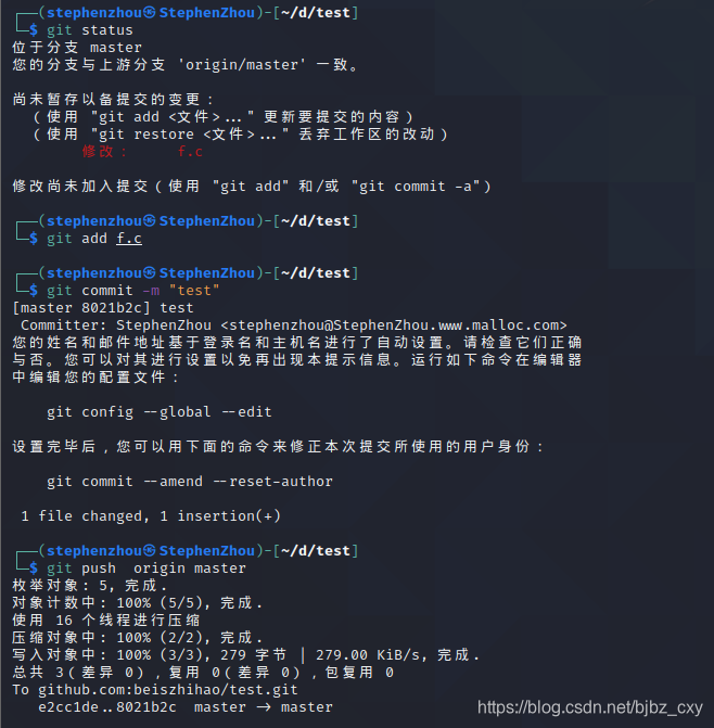 git commit 会为我们生成40位的哈希值,用于作为id,并把刚刚用git add添加到提交缓存区里的文件提交到本地仓库中,便于我们回滚,至此,这个文件就已经添加到本地仓库中了,同时本地仓库也迭代了一个版本。