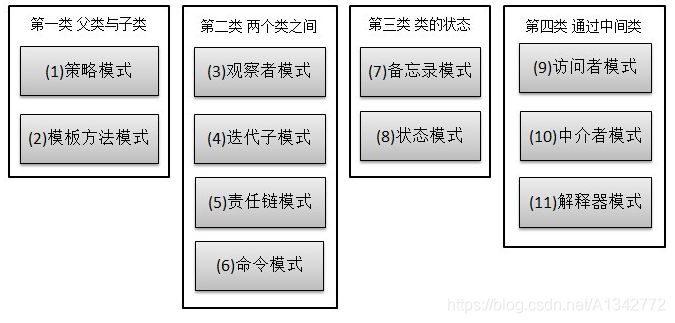 行为型模式,共十一种:策略模式、模板方法模式、观察者模式、迭代子模式、责任链模式、命令模式、备忘录模式、状态模式、访问者模式、中介者模式、解释器模式。