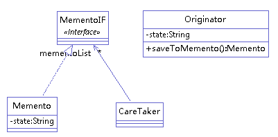 1 | public class Memento implements MementoIF{ private String state; public Memento(String state) { this.state = state; } public String getState(){ return state; } } |