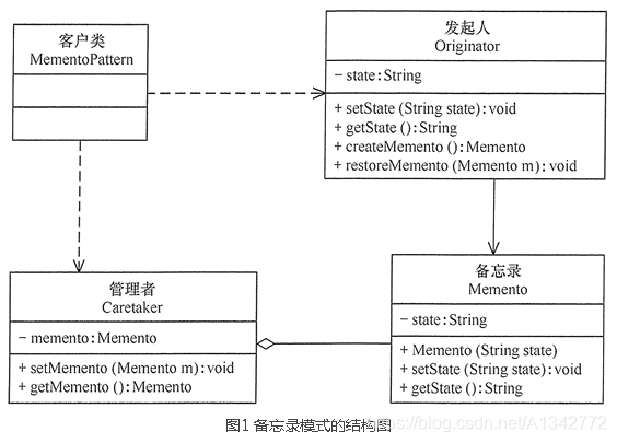 定义: 在不破坏封装性的前提下,捕获一个对象的内部状态,并在该对象之外保存这个状态,以便以后当需要时能将该对象恢复到原先保存的状态。该模式又叫快照模式。