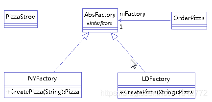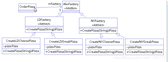 举例:(我们依然举pizza工厂的例子,pizza工厂有两个:纽约工厂和伦敦工厂)。类图如下: