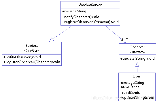 1 | public interface Mediator { void register(Colleague colleague); // 客户注册 void relay(String from, String to,String ad); // 转发 } |