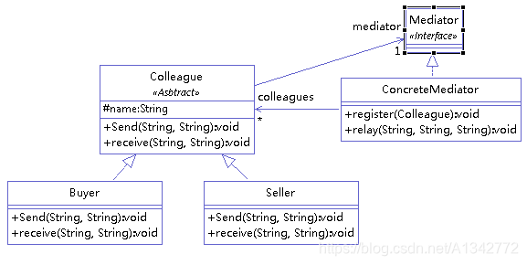 1 | public abstract class Colleague { protected Mediator mediator; protected String name; public Colleague(String name) { this.name = name; } public void setMedium(Mediator mediator) { this.mediator = mediator; } public String getName() { return name; } public abstract void Send(String to, String ad); public abstract void receive(String from, String ad); } |