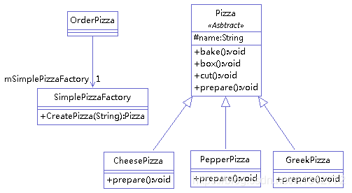 pizza工厂一共生产三种类型的pizza:chesse,pepper,greak。通过工厂类(SimplePizzaFactory)实例化这三种类型的对象。类图如下:
