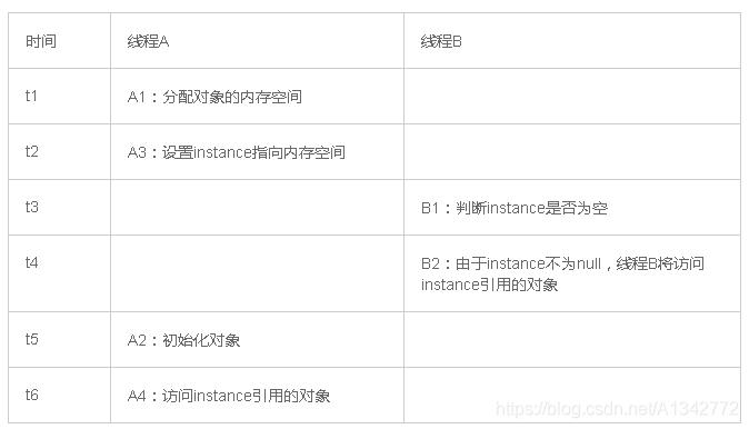 jvm为了提高程序执行性能,会对没有依赖关系的代码进行重排序,上面2和3行代码可能被重新排序。我们用两个线程来说明线程是不安全的。线程A和线程B都创建对象。其中,A2和A3的重排序,将导致线程B在B1处判断出instance不为空,线程B接下来将访问instance引用的对象。此时,线程B将会访问到一个还未初始化的对象(线程不安全)。