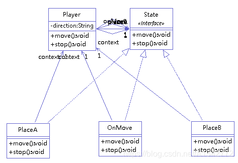 1 | public class Player { State placeA; State placeB; State onMove; private State state; private String direction; public Player() { direction = "AB"; placeA = new PlaceA(this); placeB = new PlaceB(this); onMove = new OnMove(this); this.state = placeA; } public void move() { System.out.println("指令:开始移动"); state.move(); } public void stop() { System.out.println("指令:停止移动"); state.stop(); } public State getState() { return state; } public void setState(State state) { this.state = state; } public void setDirection(String direction) { this.direction = direction; } public String getDirection() { return direction; } } |